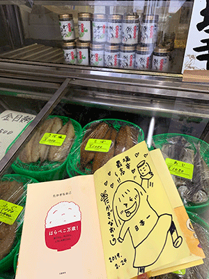 2019年2月26日(火)桜と珍味。 先週末、家族で静岡県河津町の河津桜まつりに行ってきました。 河津桜は早咲きのピンク色の桜で、前から一度見に行ってみたかったんです。 ちょうど見頃で、かなり混雑するだろうなぁ〜と思ったので、土曜から泊りがけで行きました。 土曜は用事を済ませてから行ったので着いたらもう日暮れで、夕食をとったのち夜桜見物。 ![]() 夜になってもまだ観光客いっぱい! 本当に満開ですごくきれいで、娘(今月で2歳になりました)も大はしゃぎしてましたが、ちょっと寒かったのでさくっと見物して宿に行き、温泉であたたまって早めに就寝。。。 そして次の日はがんばって早起きして、朝7時半には会場に行きました。 前日の夜桜もきれいでしたが、明るい中で見る河津桜はピンク色が映えてめちゃくちゃきれい! ![]() ![]() ![]() ぶらぶらと散策を楽しみましたが、そのうちどんどん人が増えて大変なことになってきたので、うしろ髪ひかれつつ10時過ぎに会場をあとにしました。 お天気も良くて、いいお花見ができてよかったです。 娘もにこにこ嬉しそうでした。 そして帰り道にはちょっと網代にも寄り道しました。 網代といえば拙著『はらぺこ万歳!』にも描いたお気に入りの塩辛のお店があり、また買いに立ち寄ったのです。 そしたら店頭に『はらぺこ万歳!』を飾ってくださってる〜! ![]() だいぶ長いこと置いてくださってるようで、日に焼けてました。 店主さんにおそるおそるご挨拶してみると、読者さんがちょこちょこ買いに来てくださってるとのこと。 本の中では特に店名も入れずあまり似せもせず描いちゃったのですが、読者さんがどこのお店か探り当ててくれて、中にはリピーターになって何度も買いに来る人もいたり、「たかぎさん結婚して子どもも生まれたんですよ〜」なんて報告してくれる人もいるとのことで、店主さんいろいろとよくご存知でした。 本を読んで行ってくださった方、どうもありがとうございます。 あらためてご紹介させていただくと、網代にある丸亀名産店さんというお店です。 電話注文のほかネットショップでも購入できるようなので、遠方の方はこちらも是非どうぞ〜。 ![]() ![]() 店頭にあった本にサインもさせていただきました。 そして翌日さっそく買ってきた塩辛をいただきました。 今回は本にも登場したイカのあたま(軟骨)の塩辛のほか、イカのくち(トンビ)の塩辛というのも買ってみました。 あと店主さんが作ったばかりというなまこ酢もくださいました。 ![]() あたまの塩辛はコリコリ歯ごたえがあって味も濃厚で、やっぱりめちゃおいしい! そしてくちの塩辛もぐにぐに弾力があって何度も噛みしめる感じで、これもいい! なまこ酢もぬるっとこりっとたまらんうまさ。 ![]() ![]() ![]() 左からあたま、くち、なまこ、です。珍味万歳! 白いごはんがいくらでもすすんで怖いくらいですが、幸せなうまさです。 夫も気に入ってバクバク食べてます。 もっといっぱい買ってこればよかったかな…。 あと同じ『はらぺこ万歳!』の中で出てくる具沢山のスペシャル納豆のお店はどこですか?という質問もときどきいただくのですが、こちらは下高井戸にある居酒屋たつみの「おまつり納豆」というメニューです。 大と小があるのですが、ぺろっといけちゃうので、大がおすすめです。 1階で売られてる鯛焼きも大人気なのですが、居酒屋のほうでも揚げ鯛焼きが注文できて、不思議とお酒と合う気がします。 ほうれん草サラダや厚揚げも好きなメニューです。 ちょっとガヤガヤうるさめですが、おいしくて安くていいお店です。 …って、妊娠出産してからちっとも行けてないんですが。 たまには行きたいなぁ〜。 |