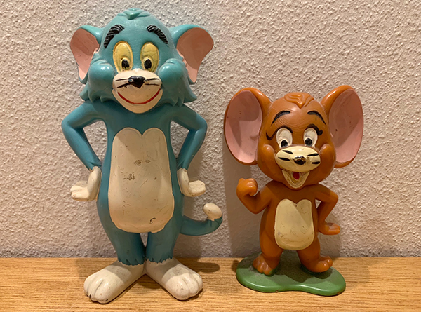 これは長年私の仕事机まわりに飾っているトムとジェリーフィギュア。 まだコミックエッセイデビューする前のバイト時代に吉祥寺のアンティークおもちゃ屋で見つけて買ったものです。 けっこう高くて5000円前後したと思うのですが、なけなしのお金で思い切って買った記憶があります。 いまでもお気に入りです。